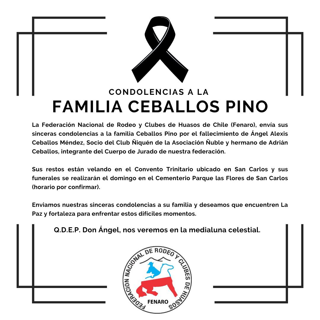 La Federación Nacional de Rodeo y Clubes de Huasos de Chile (Fenaro), envía sus sinceras condolencias a la familia Ceballos Pino por el fallecimiento de Ángel Alexis Ceballos Méndez, Socio del Club Ñiquén de la Asociación Ñuble y hermano de Adrián Ceballos, integrante del Cuerpo de Jurado de nuestra federación. Sus restos están velando en el Convento Trinitario ubicado en San Carlos y sus funerales se realizarán el domingo en el Cementerio Parque las Flores de San Carlos (horario por confirmar). Enviamos nuestras sinceras condolencias a su familia y deseamos que encuentren La Paz y fortaleza para enfrentar estos difíciles momentos. Q.D.E.P. Don Ángel, nos