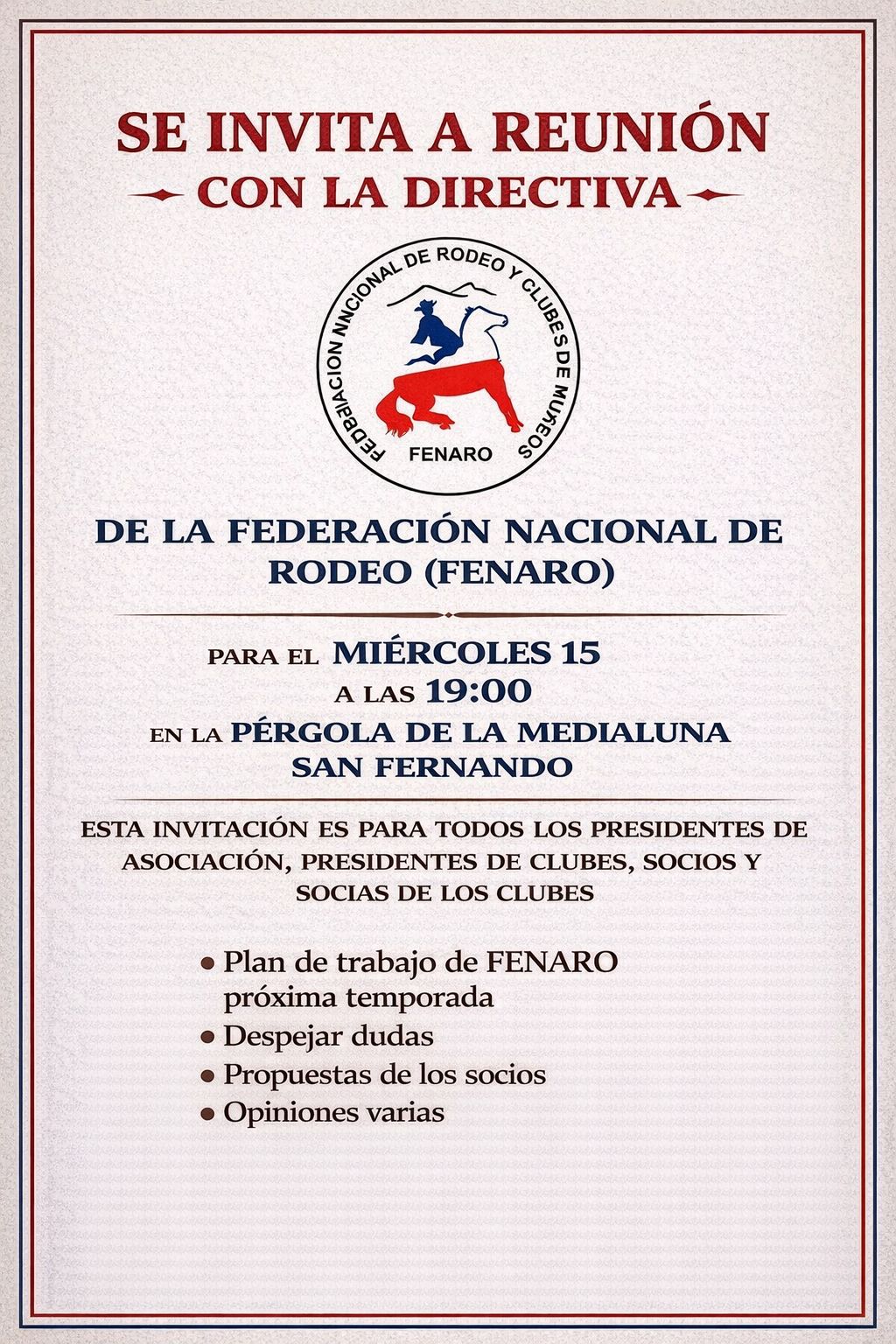 Se invita a reunión con la Directiva de la Federación Nacional de Rodeo (Fenaro) Para el miércoles 15 de abril a las 19 horas en la Pérgola de la Medialuna de San Fernando.Esta invitación es para todos los presidentes de asociaciones, presidentes de clubes, socios y socias de los clubes de Fenaro Temas a tratar: -Plan de trabajo de Fenaro para la próxima temporada -Despejar dudas -Propuesta de los socios -Opiniones varias