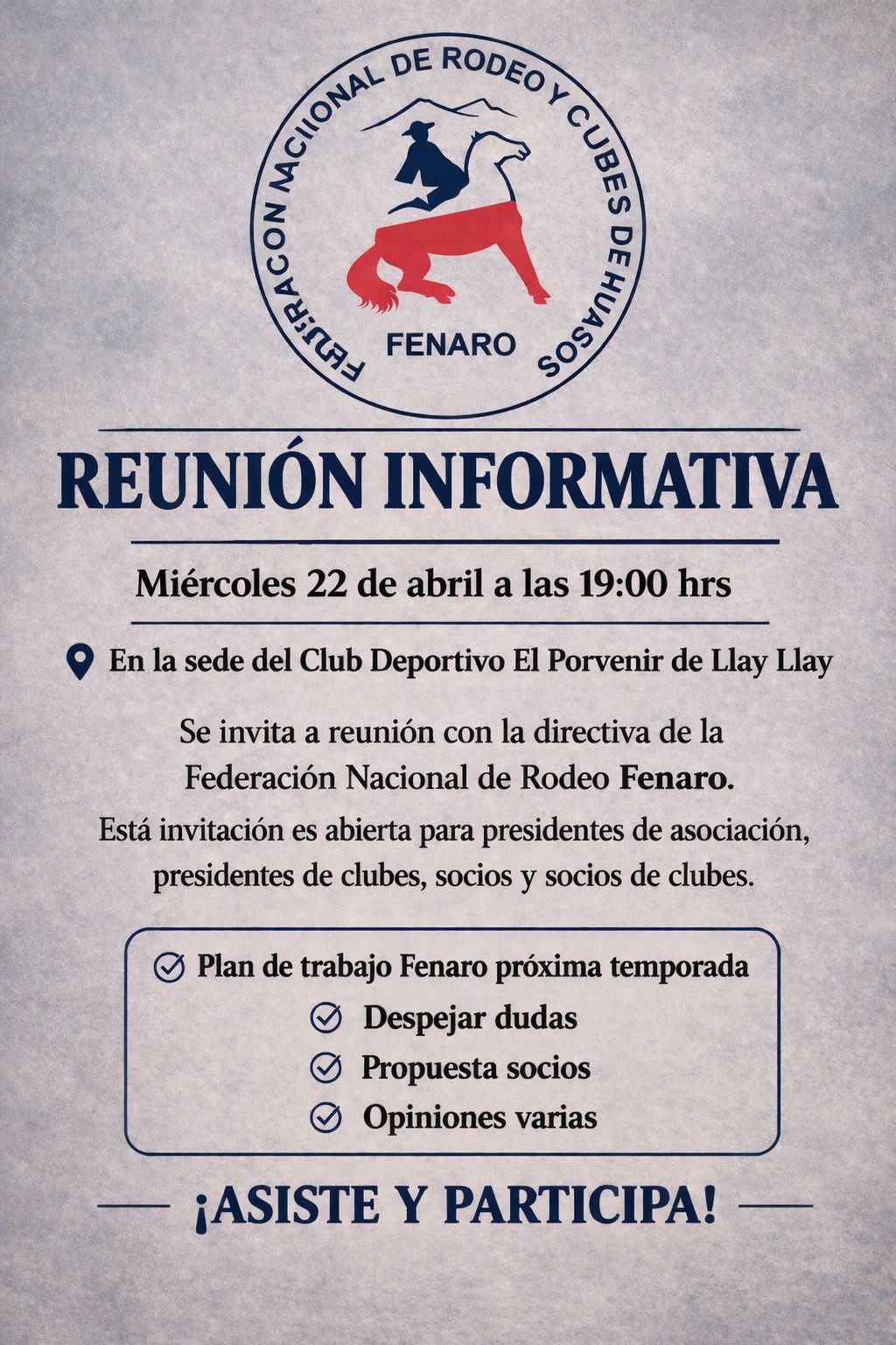 Se invita a reunión con la Directiva de la Federación Nacional de Rodeo (Fenaro) Para el miércoles 22 de abril a las 19 horas en la Sede del Club El Provenir de Llay- LlayEsta invitación es abierta para presidentes de asociación, presidentes de clubes, socios y socias de los clubes de Fenaro Temas a tratar: -Plan de trabajo de Fenaro para la próxima temporada -Despejar dudas -Propuesta de los socios -Opiniones varias