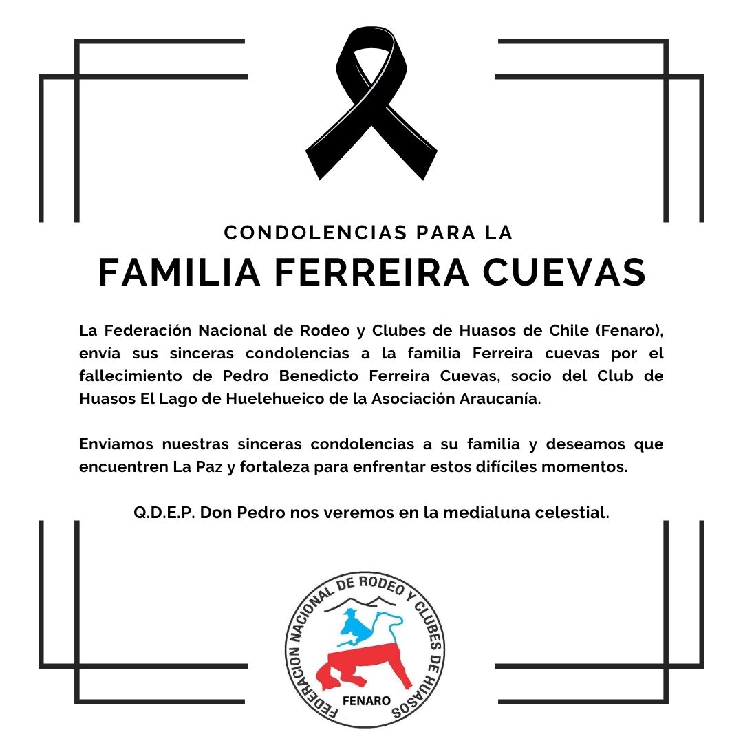 La Federación Nacional de Rodeo y Clubes de Huasos de Chile (Fenaro), envía sus sinceras condolencias a la familia Ferreira Cuevas por el fallecimiento de Pedro Benedicto Ferreira Cuevas, socio del Club de Huasos El Lago de Huelehueico de la Asociación Araucanía.