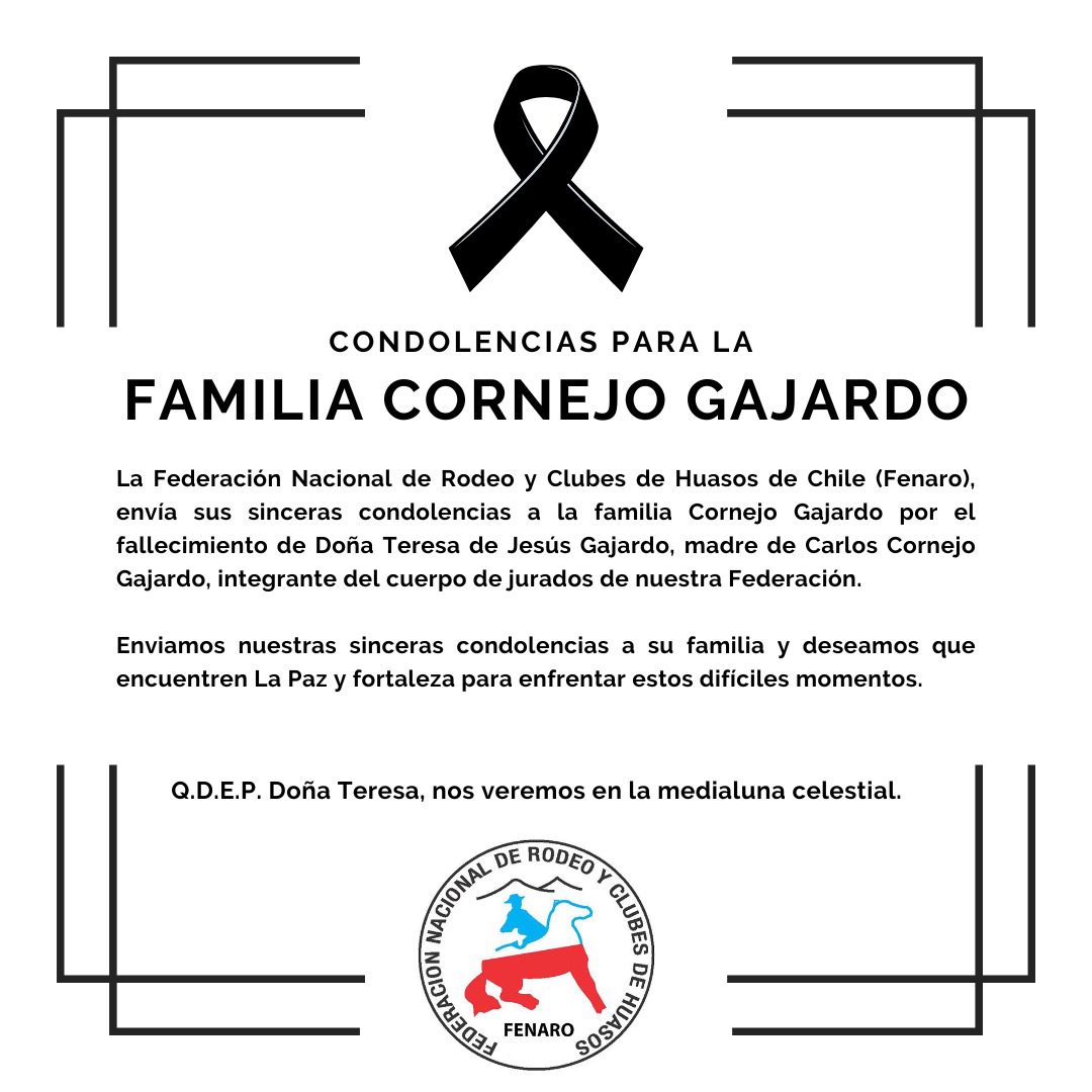 La Federación Nacional de Rodeo y Clubes de Huasos de Chile (Fenaro), envía sus sinceras condolencias a la familia Cornejo Gajardo por el fallecimiento de Doña Teresa de Jesús Gajardo, madre de Carlos Cornejo Gajardo, integrante del cuerpo de jurados de nuestra Federación.